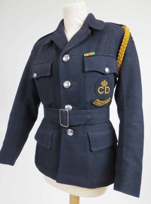 This tunic was worn during the VE Day celebrations and later parades in Halifax by a female volunteer. A whistle is carried on the lanyard over the shoulder. The sleeve has red chevrons, each indicating a year of wartime service. On the breast is the ribbon of the Defence Medal, 1939-45. This was awarded to Civil Defence personnel who had served for at least three years in an area which had been exposed to enemy attack.