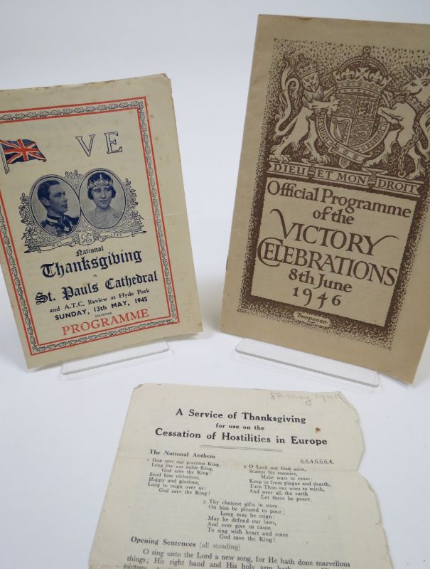 The celebrations continued after the initial Bank Holiday on 8 May, when things had been more spontaneous and there had been less time to organise. The ‘Thanksgiving at St Pauls Cathedral’ on 13 May included details of a parade by members of the Air Training Corps (ATC) in Hyde Park and noted that similar parades would be taking place at that time throughout the country to honour the Royal Air Force.