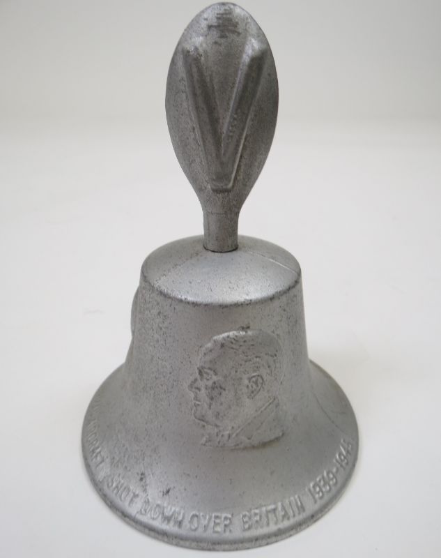 This hand bell was one of many commercially manufactured souvenirs made in the months following VE day. They were advertised for sale by post or from Gas and Electricity Showrooms and Golf Clubs. One was auctioned for charity (probably the RAF Benevolent Fund) for £1,200 at the first Battle of Britain Memorial Dinner in 1945, about £53,000 today.
