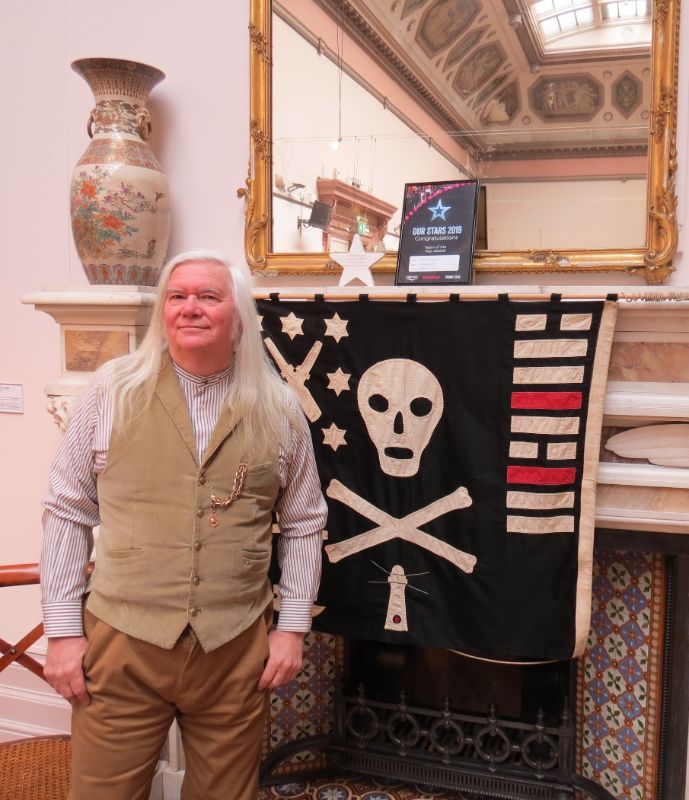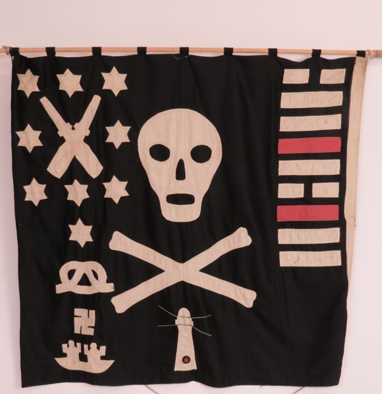 In return, the submarine’s commander, Lieutenant A.D. Piper DSO presented her ‘Jolly Roger’ ensign to the town. It had become a tradition for submarine crews to sew and fly these on their return to port after a patrol. Each carried symbols describing their victories and those on the Unsparing’s are as follows: