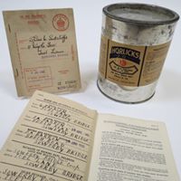 This tin of Horlicks patent health drink, in its ‘wartime economy’ packaging was labelled as being only available on prescription. Horlicks was also contained in military emergency ration packs.